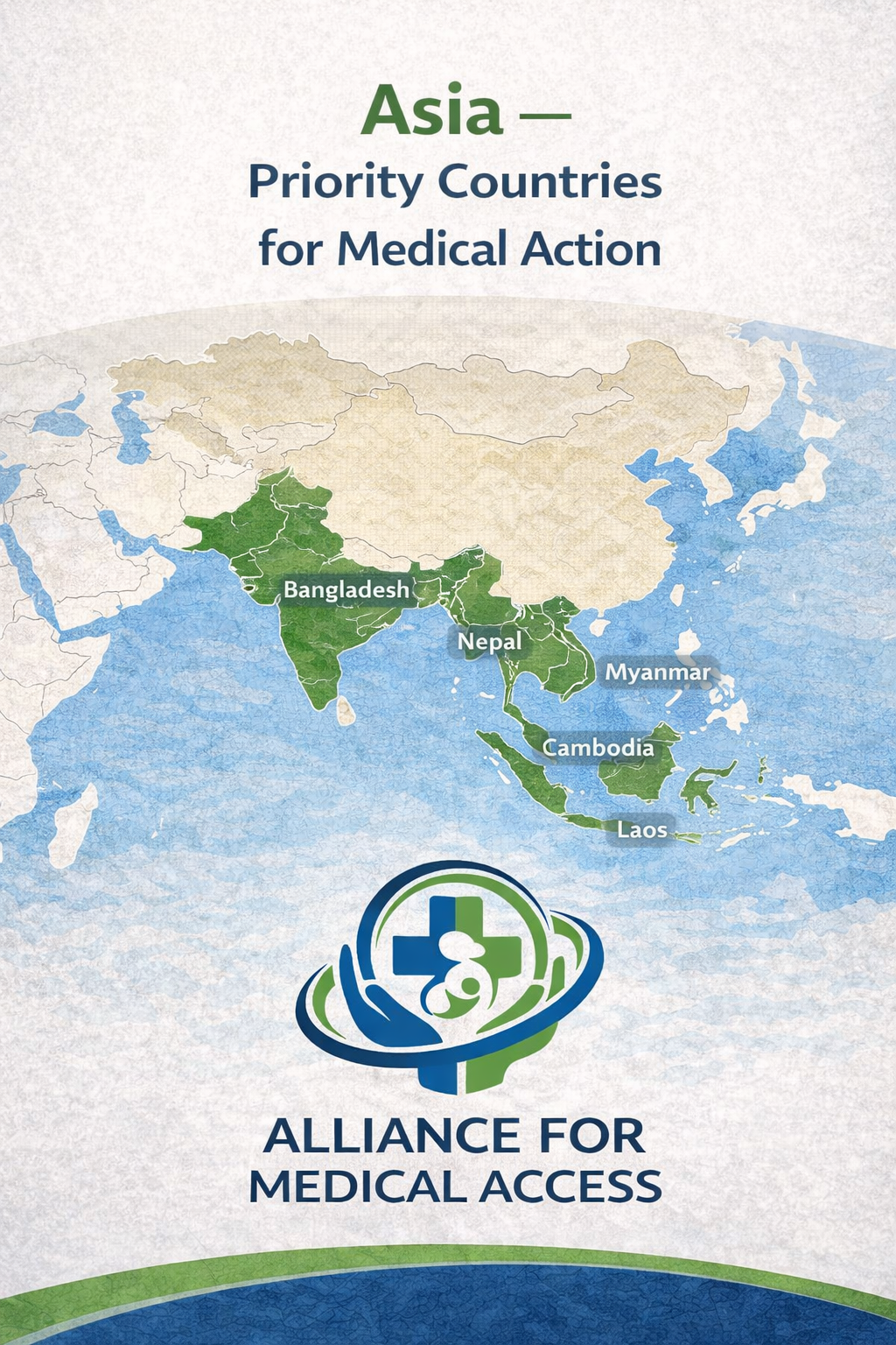 Asia represents a strategic area of action for Alliance for Medical Access, where high population density, poverty, and fragile healthcare systems create urgent medical needs. Our approach is adapted to each country’s specific challenges while maintaining a strong focus on access, quality, and sustainability.
